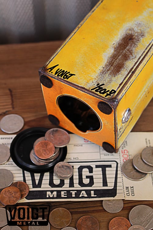 The bank is primarily constructed from metal tubing and various odds and ends harvest from our industrial evolution. This banks durable construction ensures generations of use and abuse.